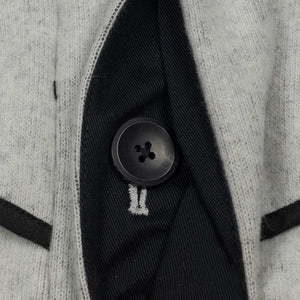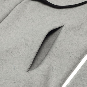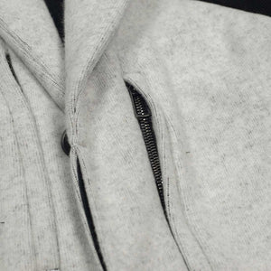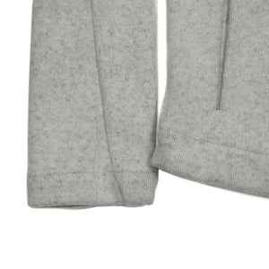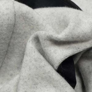 85% cotton, 13% nylon, 2% elastane fleece body in light heather grey; 100% cotton fleece lining in black; 97% cotton, 3% elastane ribbed trim in armits for comfort and mobility