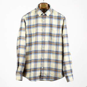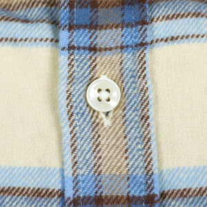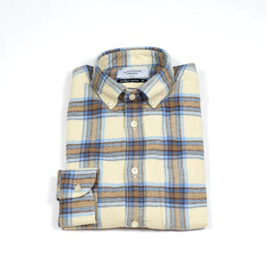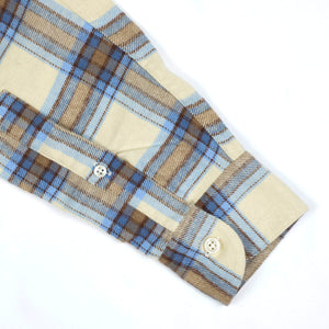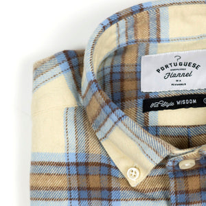 A sturdy, surpremely soft flannel, made up here in a vintage looking check of sky blue and brown with a beige base.