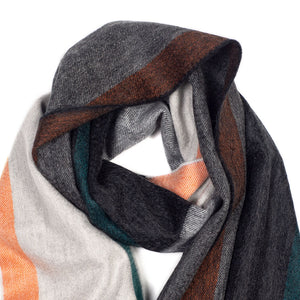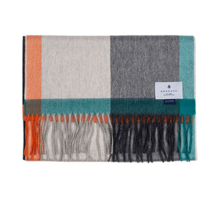 Superbly soft and indulgent, this 100% cashmere scarf is made in Scotland by the very best in the world: 150 year-old Begg & Co. The large blocks of complementary natural colors, accented by the orange and green edges make for a perfect accessory to bring a bit of color into a winter outfit.
