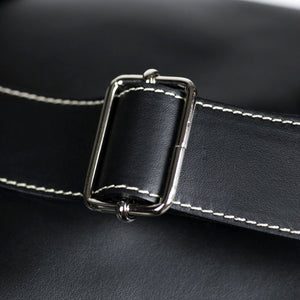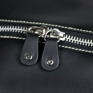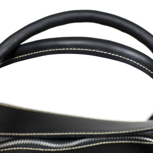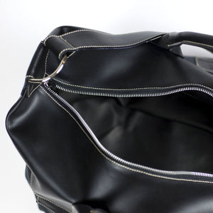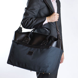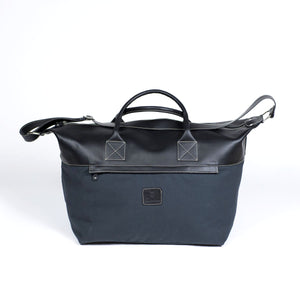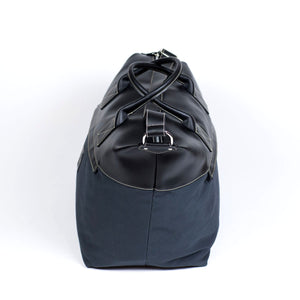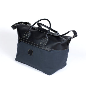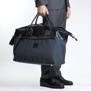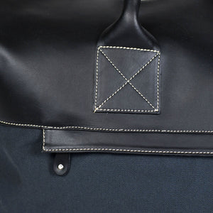A spacious and striking duffel bag in a combination of leather and cotton canvas. Wide shoulder strap and two outside zipped pockets make it a practical travel companion.