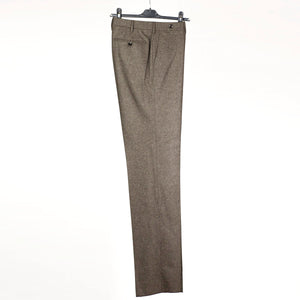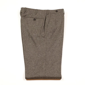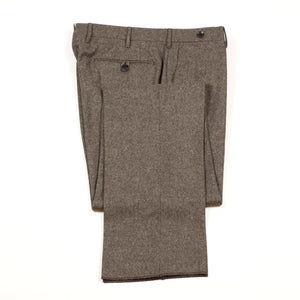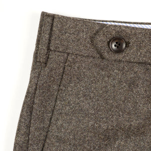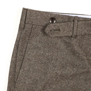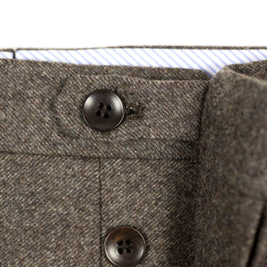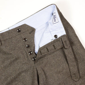 These wool trousers are cut from a soft medium weight wool cloth in a slim pattern. With their distinctive and rakish extended waistband closure, shirt-stripe lining and thoughtful details, they will pair nicely with a sport coat or cashmere sweater.
