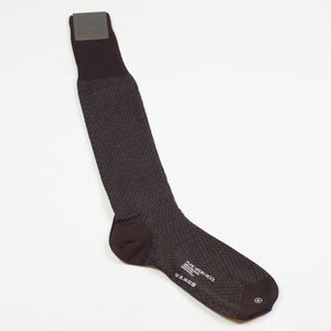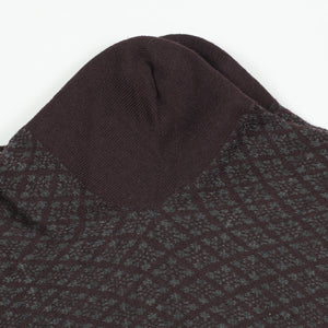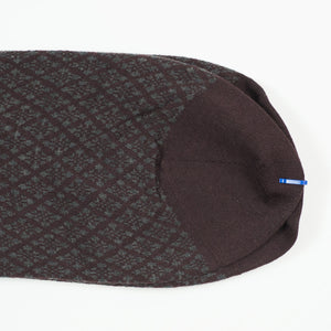 These over-the-calf socks have a burgundy background with grey diamond patterns. Made in Italy of fine wool with some nylon for better performance, the toes are hand-linked for wearing comfort.
