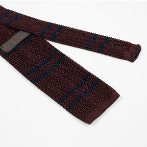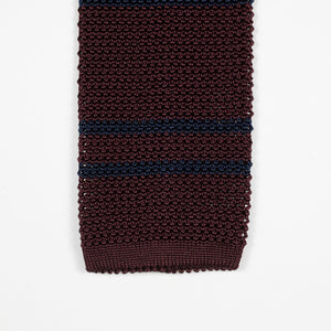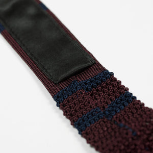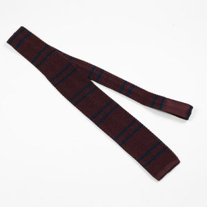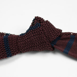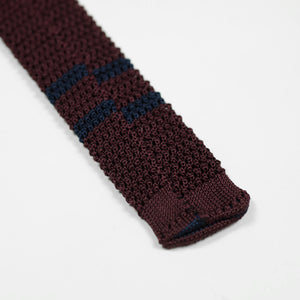 Burgundy square bottom silk knit tie, navy stripes