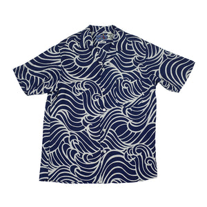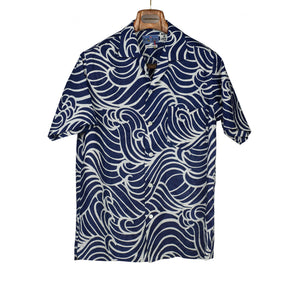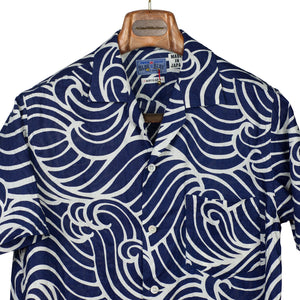 Our favorite camp shirt style returns in a striking wave print, using the bassen relief dying technique to give strong contrast between the natural linen color and the indigo used.