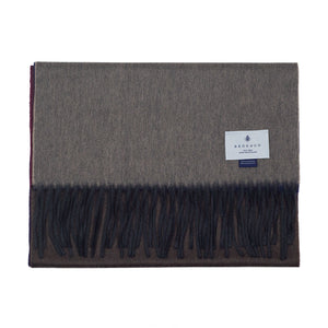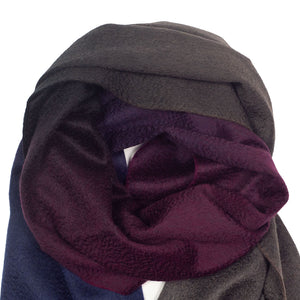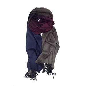 True winter indulgence with this 100% cashmere scarf made in Scotland by the very best in the world: 150 year-old Begg & Co. With rich colors gradually shifting from blue to burgundy and brown, its remarkable appearance is due to the skill and mastery of cashmere fibers being hand-dyed, and then manually fed into the loom.