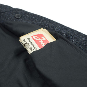 Frank himself calls this "the standout fabric of the season", and it lends itself beautifully to this classic double breasted coat. Made by a small company in South Tyrol, it has a great weight and hand, with the bright blue donegal giving a lot of life. The included vintage East German communist newspaper has two holes cut out, so that it can be used for spying and observing.
