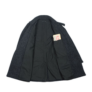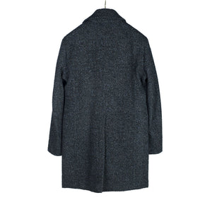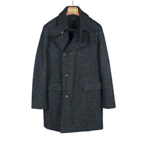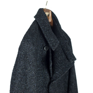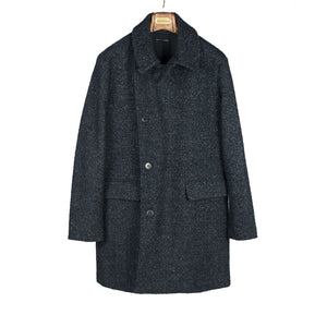 Double breasted coat in black and blue donegal herringbone with spy paper