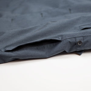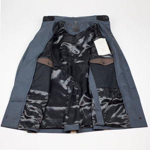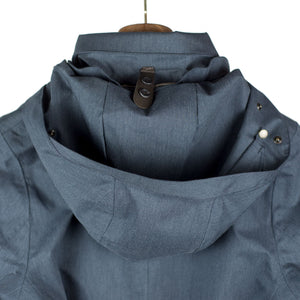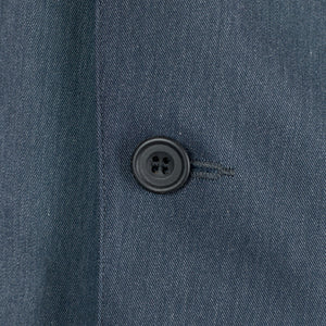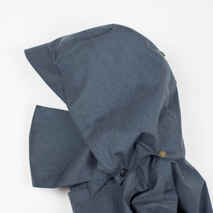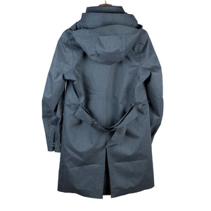 A double breasted coat with a distinctive closure - well cut, easy to wear, and easy to style. With its lightweight denim fabric, this jacket is super functional; packs and stows away when it is not protecting you from the rain.