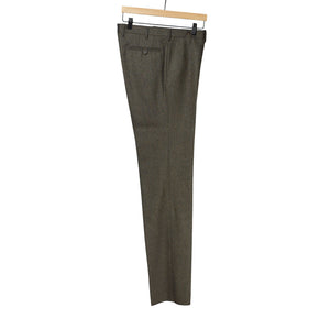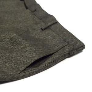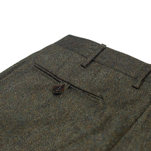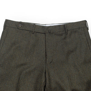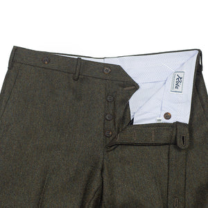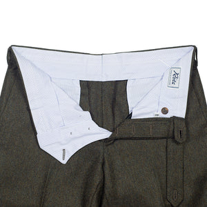 Perfect for a fall color palette of browns, rusts, charcoals and greens. These wool trousers are cut from a soft medium weight wool cloth in a slim pattern. With their distinctive and rakish extended waistband closure, shirt-stripe lining and thoughtful details, they will pair nicely with a sport coat or cashmere sweater.