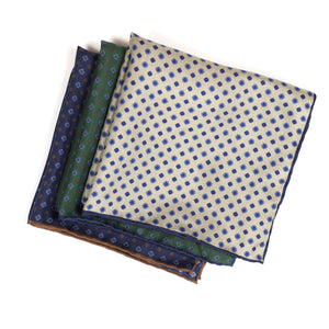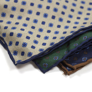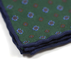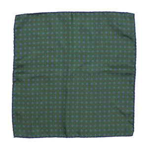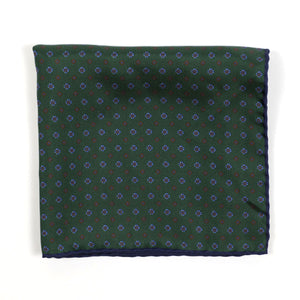 A classic square in a striking combination of green and blue, with navy handrolled edges and brown & blue neat patterns.