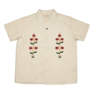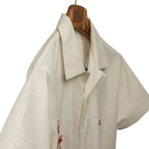"Even on a simple camp shirt they manage weave in some serious art. Individual pieces of khadi are embroidered on using a frame and then sewn into garment. Using a traditional weaving technique named ari, the result is an exquisitely ornate and colored floral embroidery on each panel delivering a wonderfully tasteful camp shirt."---Kenshawn