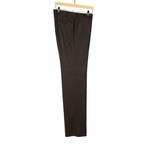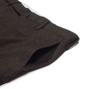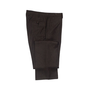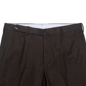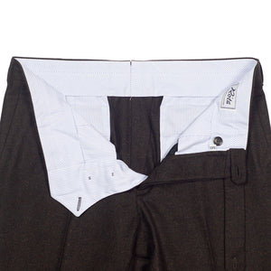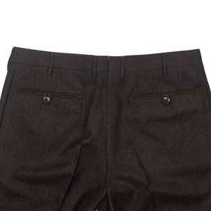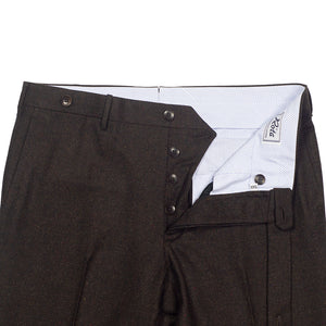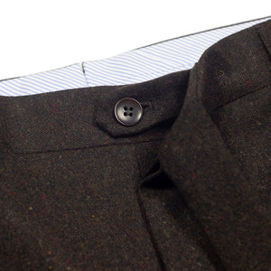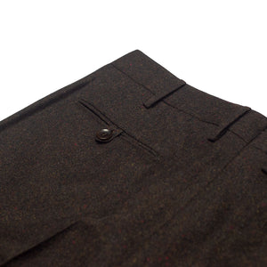These wool trousers are cut from a soft medium weight donegal wool cloth in a slim pattern. With their distinctive and rakish extended waistband closure, shirt-stripe lining and thoughtful details, they will pair nicely with a sport coat or cashmere sweater.