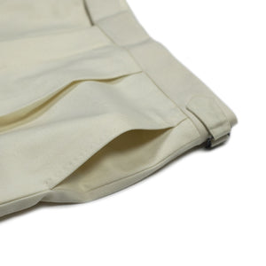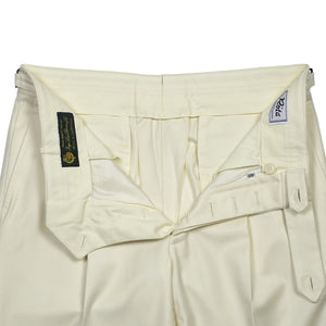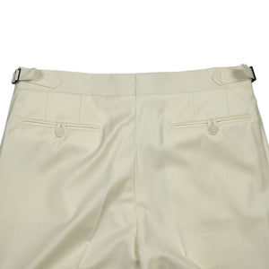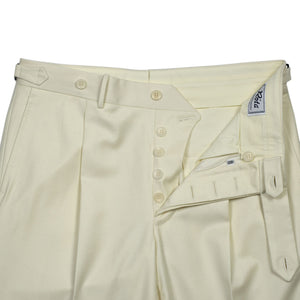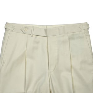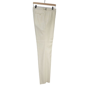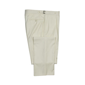 The classic winter white trousers. For those who prefer a little more room in the top block, these trousers are cut with single pleats yet a slim leg, higher rise and side adjusters. Cut from a soft medium weight wool cloth in a slim pattern, they feature an extended waistband closure, shirt-stripe lining among numerous thoughtful details.