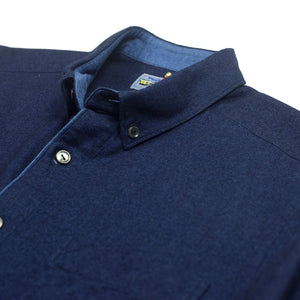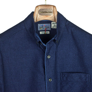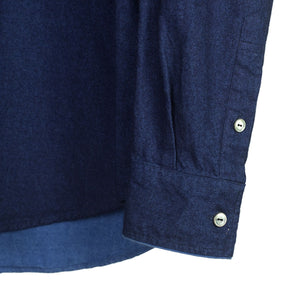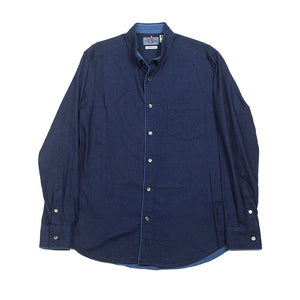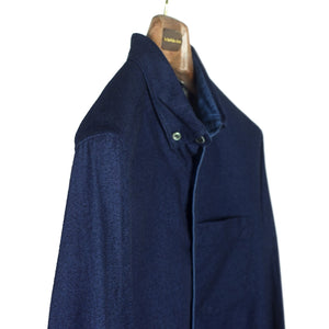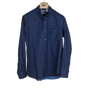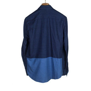 Just a nice way to embrace the various shades of blue that repeated dyings of indigo can bring, this shirt has a rear skirt and front placket in contrasting light blue.