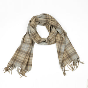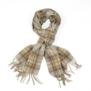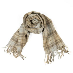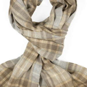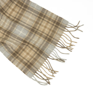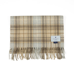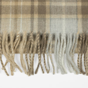 Begg's Jura mix of lambswool & angora offers a beautiful soft hand and this scarf's beige plaid design is both elegant and classic