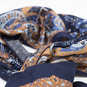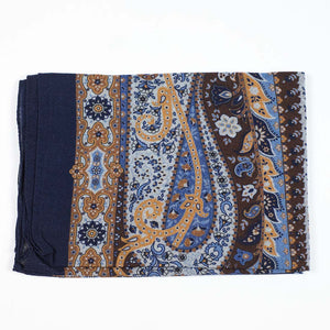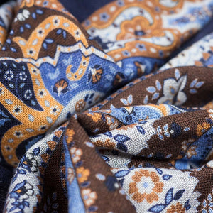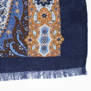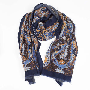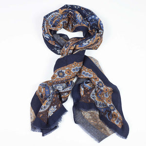 Lightweight wool print scarf, navy, orange & brown large paisley print