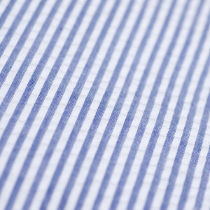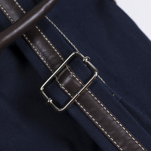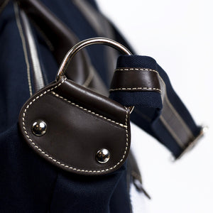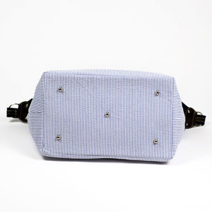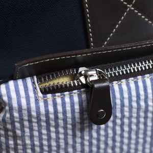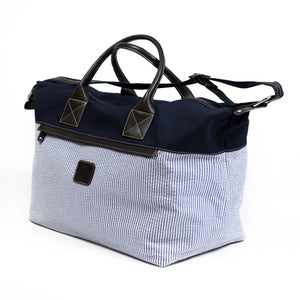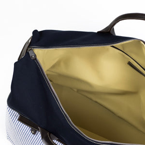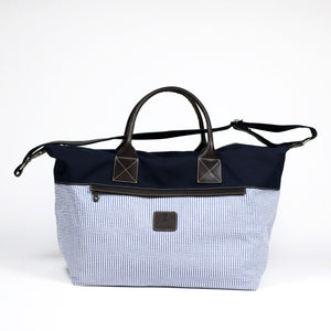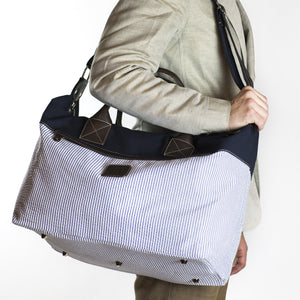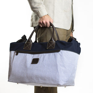 A spacious and seasonal duffel bag in a combination of cotton canvas and seersucker, with brown leather straps and accents. A wide shoulder strap and two outside zipped pockets make it a particularly practical travel companion.