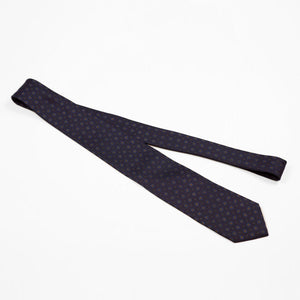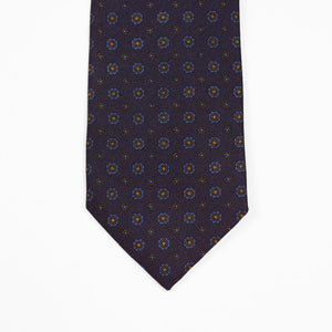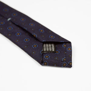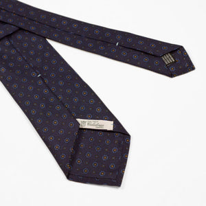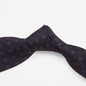Navy silk twill tie, blue & gold rosette neat print