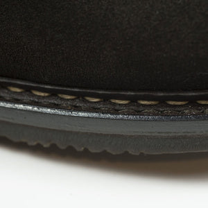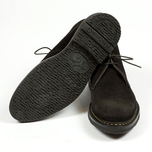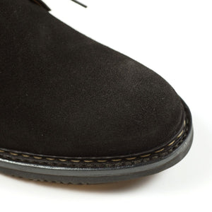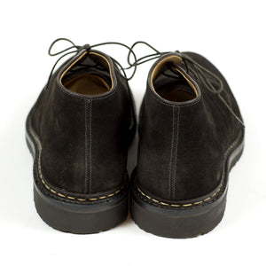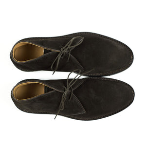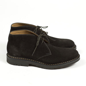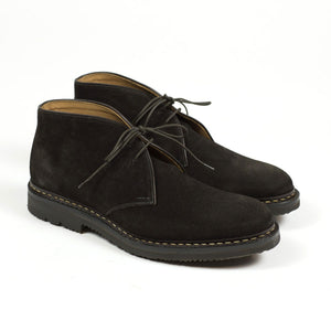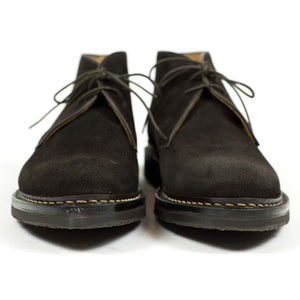 Heschung's handsome interpretation of the "desert boot" chukka, made from the best suede and construction. The tasteful combination of a sturdy Norwegian welt on rubber sole, and beautiful dark brown suede makes it a great boot to wear with chinos as well as denim.