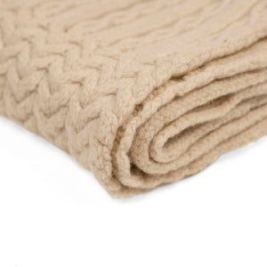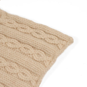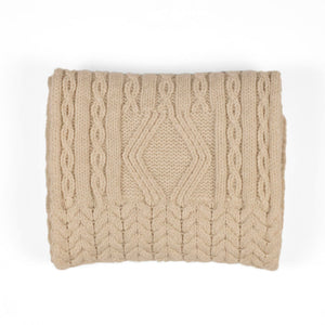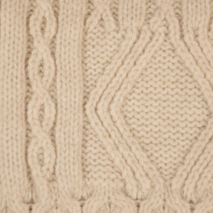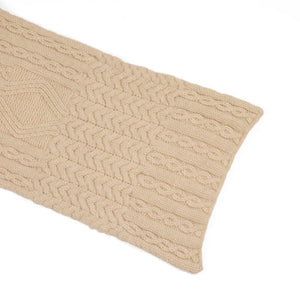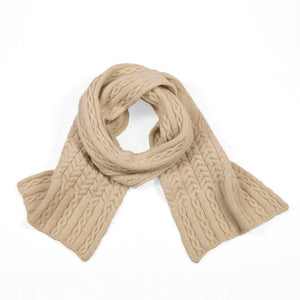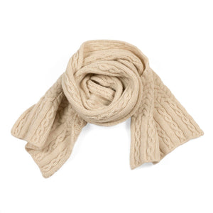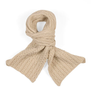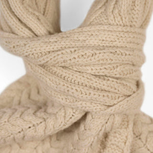 This merino wool scarf boasts beautiful Aran cabling details. The wool is soft and just voluminous enough to feel warm and protected against the cold.