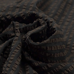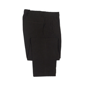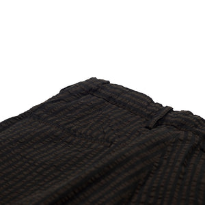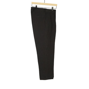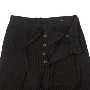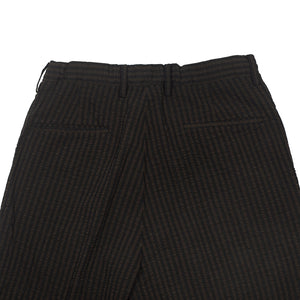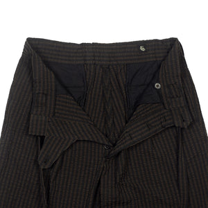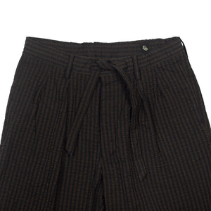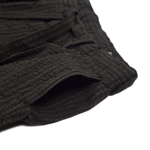 Pleated travel trousers in black and brown Finx cotton and silk seersucker