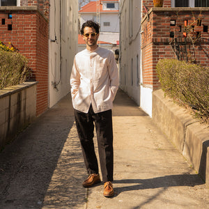 We will never pass up an opportunity to get new pieces in Kaptain Sunshine's cotton and silk seersucker - it's that good. These are an updated version of last season's traveller trousers, now with two pleats for extra comfort and a relaxed fit that suits the collection nicely.