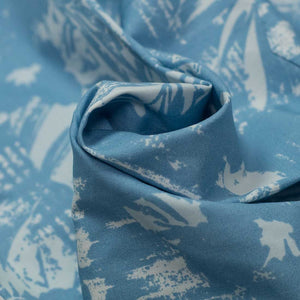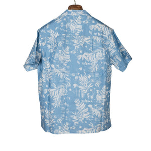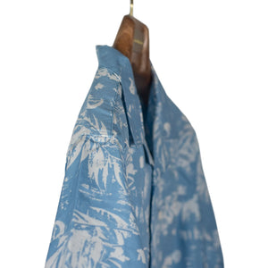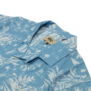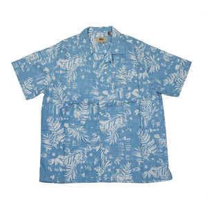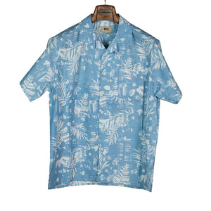 A soft, subtle take on the classic Aloha shirt, the palm leaf motif on this is the negative/white element, giving it a gentler, less contrasting effect.