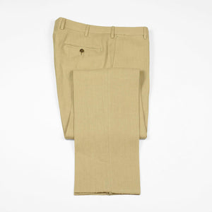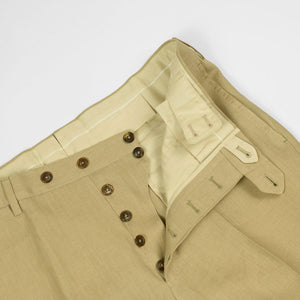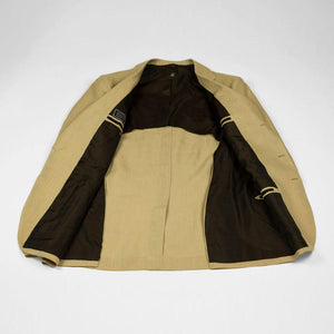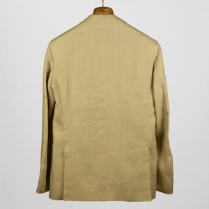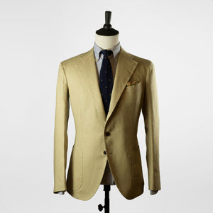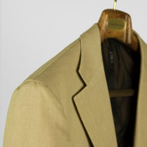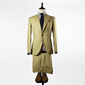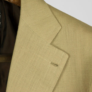 Tan linen suits are worn in the summertime by the best men dressed in the world. They have their place in every elegant man's closet. Part of a unique set of handmade suits we commissioned from bespoke Naples tailor Formosa, this single-breasted linen suit is cut from a linen cloth which combines body for better drape, with an open weave structure for better air circulation.