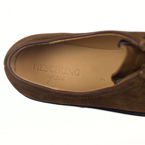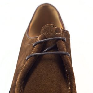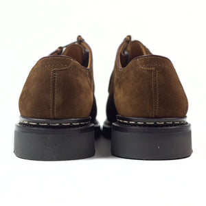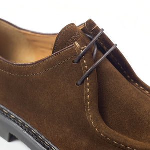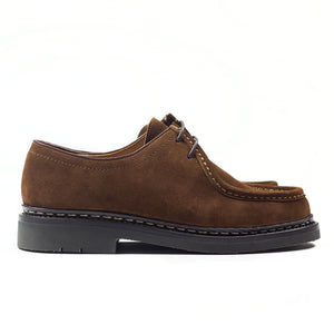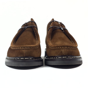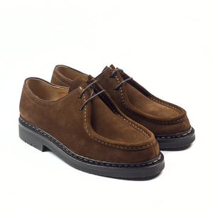 A classic style of French casual shoes, the Thuya is identified most by its strong moccasin toe. This version is in a soft and richly colored chocolate brown suede which makes for a very comfortable pairing with the natural rubber sole - you can put a lot of miles on these without batting an eye.