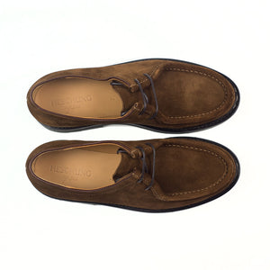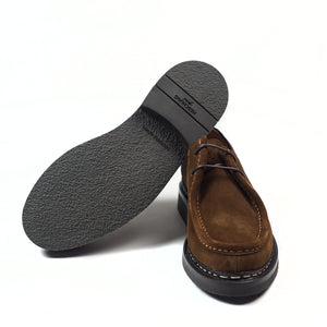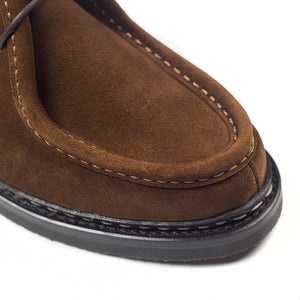 Thuya moccasin toe shoe in "noisette" chocolate brown suede, natural rubber sole