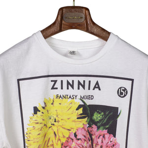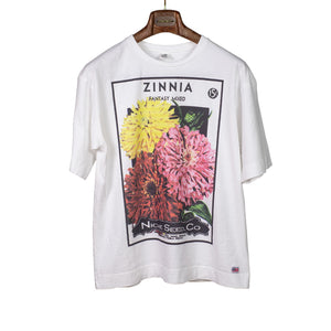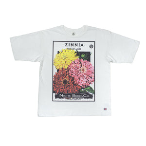 Niche's flower seed packet tees are a signature of theirs, and this one features a vibrant graphic of a Zinnia on the front, and the back label of the "seed packet" on the back.